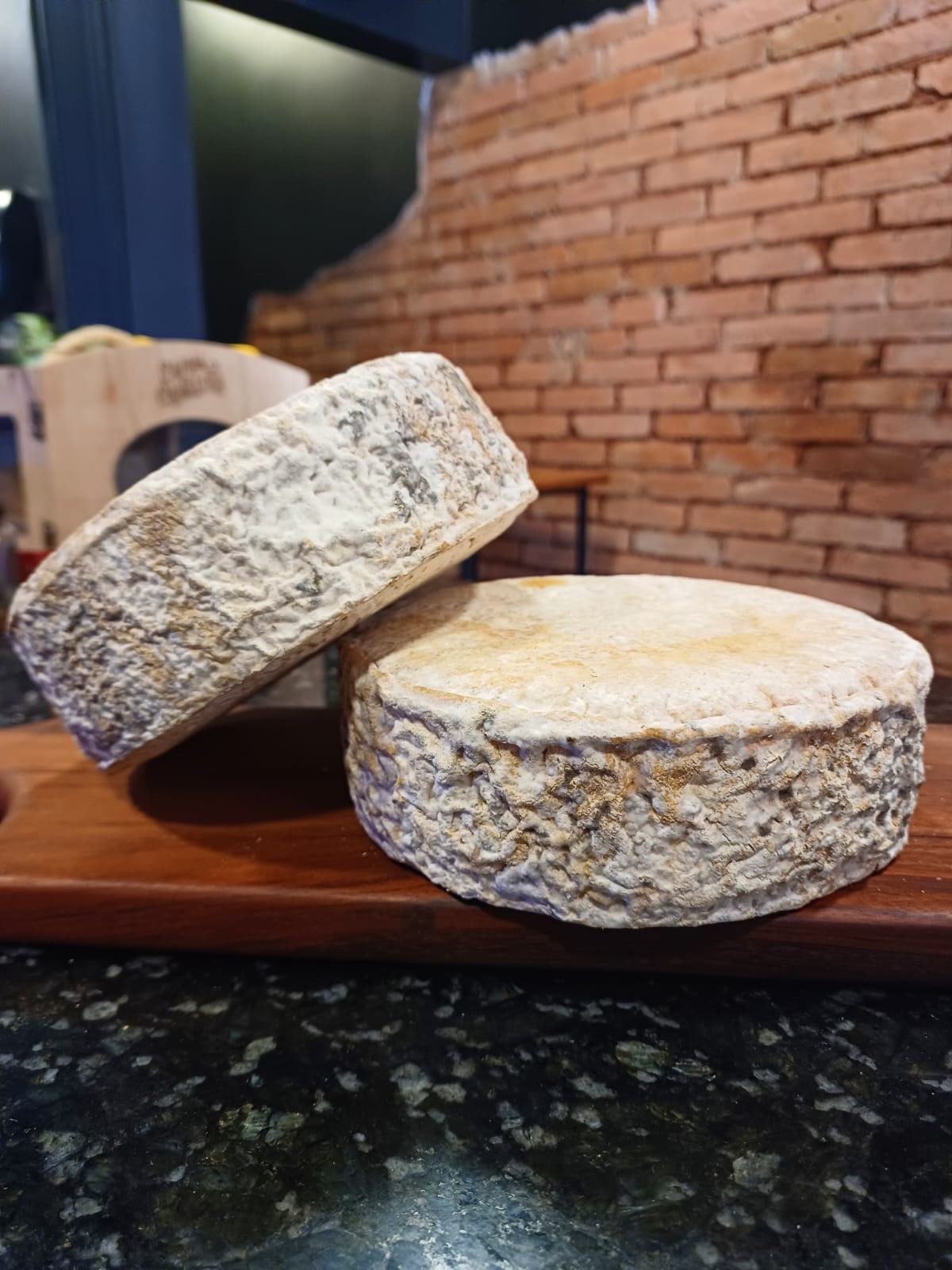 Queijos maturados em cave subterrânea com umidade alta e temperatura baixa, mofo natural, por 30 dias.